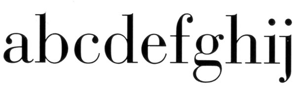 1787 Bodoni de Giambattista Bodoni. Contraste muy abrupto entre los trazos gruesos y los finos con una fuerte modulación vertical con trazos terminales muy delgados y encuadrados. Moderno. El criterio de Bodoni era crear por sí mismos imágenes hermosas e impresionantes, aunque eso supusiera peor legibilidad. La fuerte modulación vertical se contrapone a la lectura horizontal. (bell?)