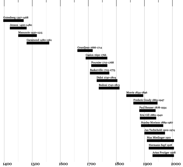 Aquí se recoge una cronología resumida de la historia de la tipografía para poder entender a grandes rasgos su evolución en sus cinco siglos y medio de historia. Esta evolución no es totalmente lineal (los tipos Antiguos, por ejemplo, que se empiezan a fabricar en Italia hacia 1450 no llegan a su esplendor hasta 1734 con William Caslon, cuando los de Transición están en su apogeo) como no lo son los ejemplos que se muestran. La mayoría de ellos son interpretaciones de las creaciones originales rediseñadas en la actualidad. Por otro lado, y al contrario de lo que se piensa, no existe un tipo único, por ejemplo, de Garamond o de Baskerville. Cada fundición ha hecho su propia versión a partir de los originales e impresiones de Claude Garamond o John Baskerville.